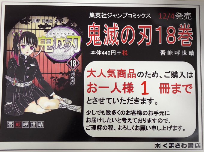 uzivatel くまざわ書店佐世保店 na twitteru 鬼滅の刃 19巻 本日入荷 猛スピードで売れてます 20巻 発売未定 そして2 10発売の週刊少年ジャンプのご予約も承っております 週刊少年ジャンプは入荷数に限りがございますので おひとり様1冊でのご予約を