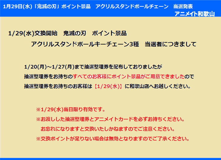 アニメイト和歌山 on twitter ポイント景品情報 1 29 水 より交換開始 鬼滅の刃 アクリルスタンドボールチェーン 3種 につきまして和歌山店では下記内容にてご案内させて頂きます 当店にて交換をご希望のお客様は注意事項のご確認をお願い致します