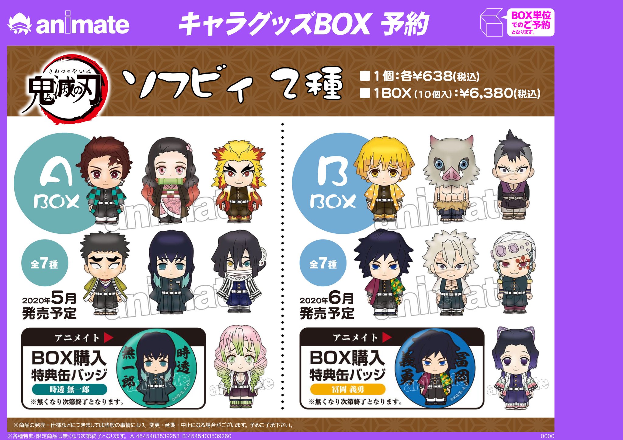 アニメイト町田 on twitter グッズ予約情報 鬼滅の刃 ソフビィ a b box が2020年5月より順次発売予定 各box購入アニメイト特典の 缶バッジ は 時透 無一郎 a box 冨岡 義勇 b box マチ アニ町グッズ予約 オンライン予約 購入も店舗受取ok a