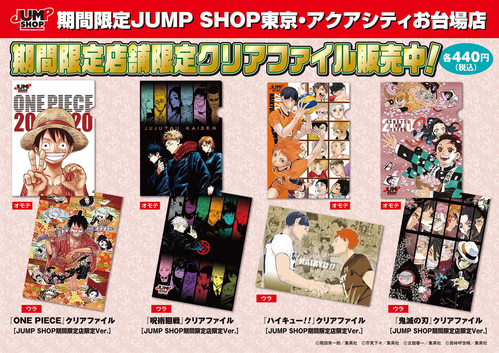 ジャンプショップ jump shop 公式 en twitter js大注目 4大タイトルフェアin jump shop福岡店 福岡店のオススメ商品は 鬼滅の刃 のダブルポケットクリアファイル 550 税 です 各キャラがお洋服をチェンジした カッコイイ柄だぞ 裏面のかわいい