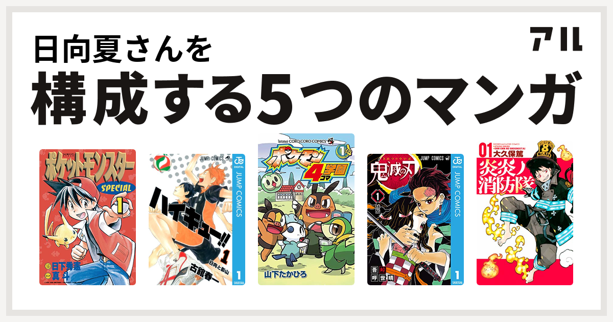 日向夏さんを構成するマンガはポケットモンスタースペシャル ハイキュー ポケモン4コマ学園 鬼滅の刃 炎炎ノ消防隊 私を構成する5つのマンガ アル