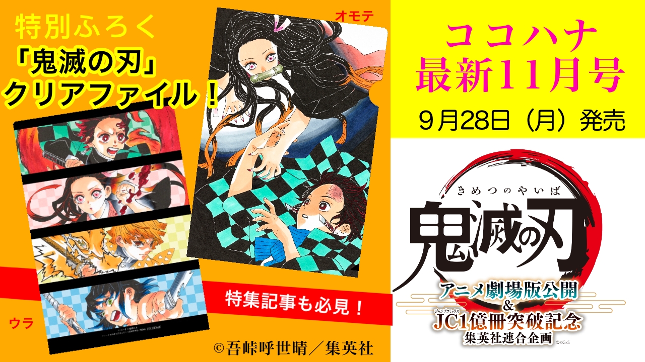 鬼滅の刃公式 on twitter 劇場版 鬼滅の刃 無限列車編公開記念 本日発売 ココハナ 11月号には原作イラストを使用したb5サイズの クリアファイルが そして more 11月号にはオフィスで使える響く言葉と名シーンを厳選したステッカーがついてきます 今後の発売