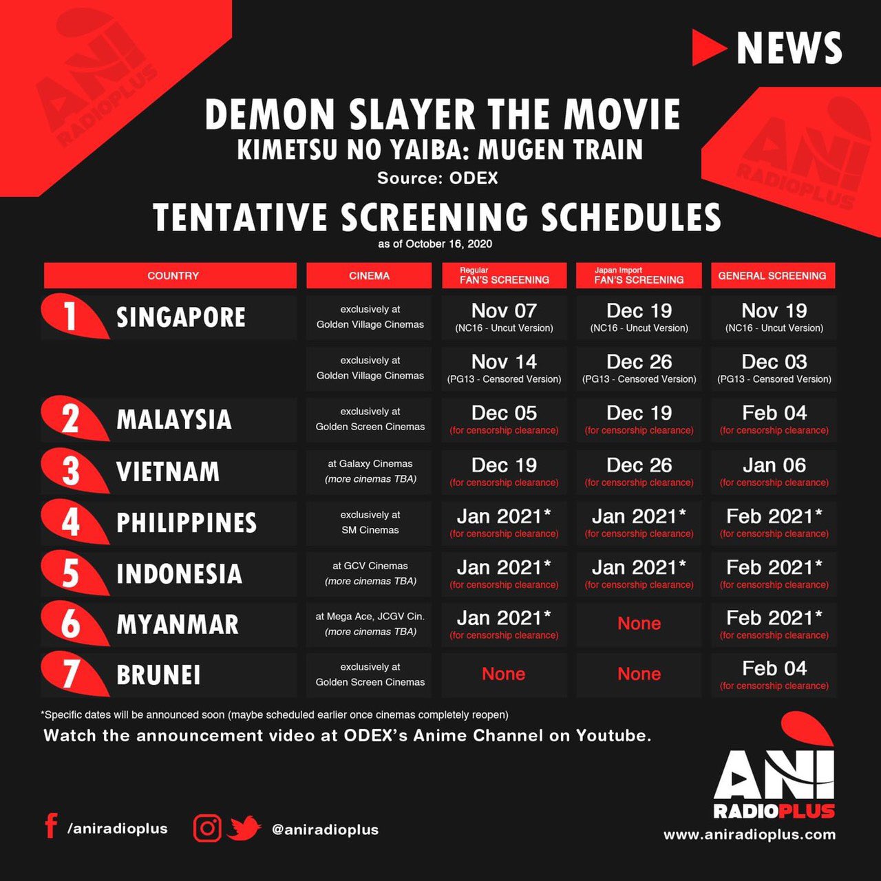 おいでよシンガポール on twitter 映画 鬼滅の刃 無限列車編の公開日程置いておくね シンガポールでは11月19日に一般放映開始 グロいシーンをカットしたpg12バージョンは12月3日放映開始予定 東南アジア各国で放映されるから 世界的な人気が伺えるね