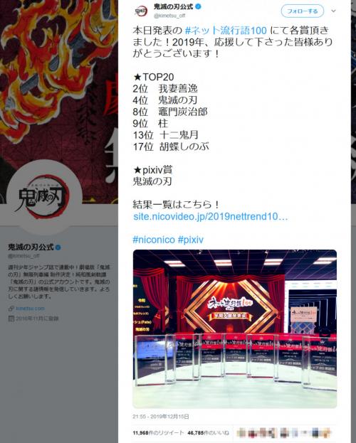 ネット流行語100 に鬼滅の刃関連ワードが多数ランクイン 公式ツイッター 2019年 応援して下さった皆様ありがとう ニコニコニュース