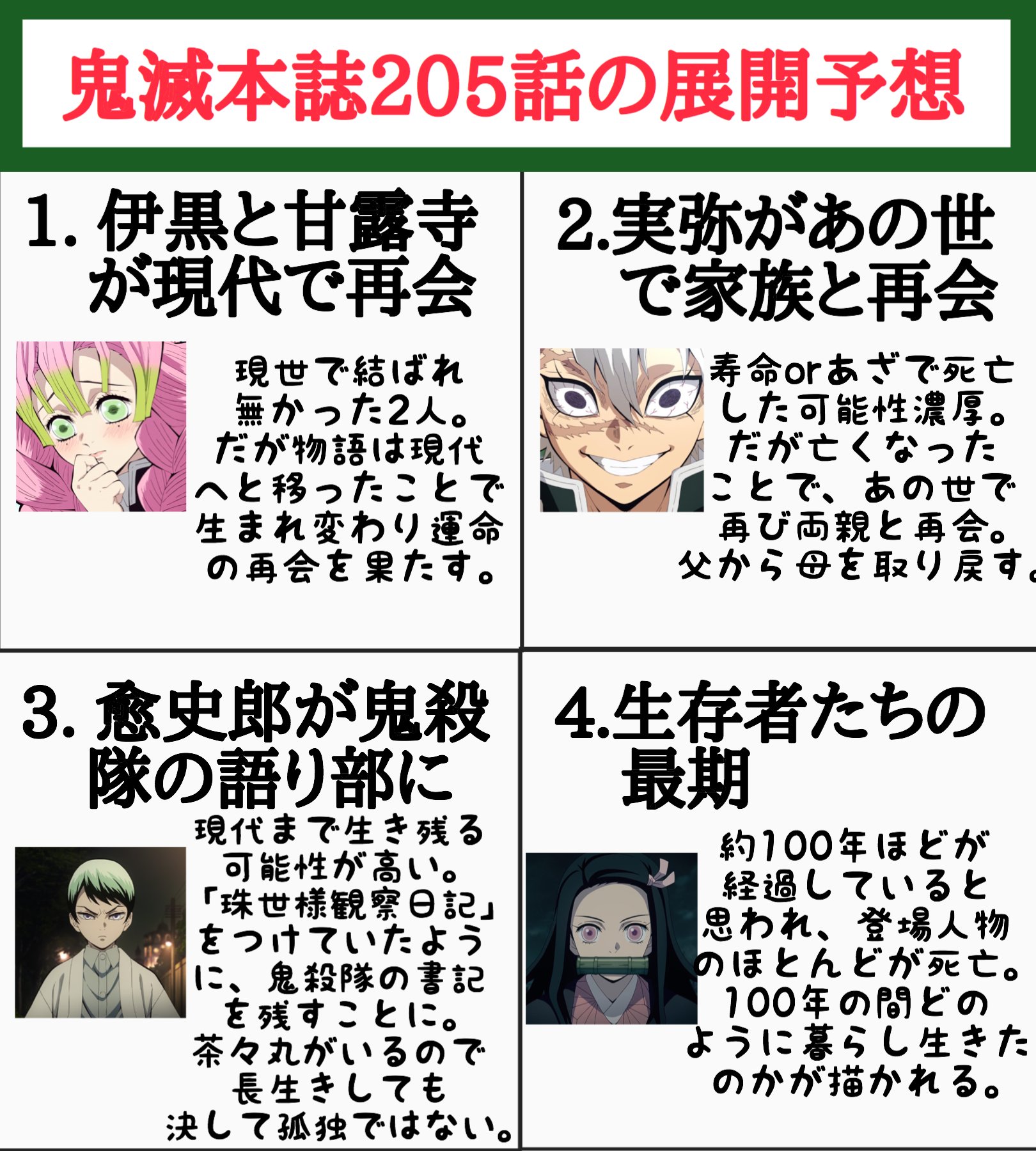 幸村 鬼滅の刃考察 a twitter 鬼滅の刃205話で予想される展開をまとめてみました おばみつの再会 実弥が両親と再会 愈史郎が語り部に 生存者たちの最期 が描かれるのではないかと思います おばみつが来世で結ばれて 最終回発情期 になりそう 鬼滅本誌