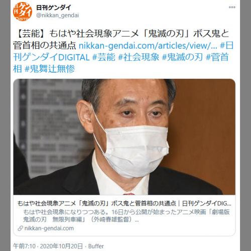 アニメ 鬼滅の刃 社会現象化 ボス鬼が 菅首相 菅首相そっくりの話題 2020 10 20 火 14時頃 ツイ速クオリティ twitter