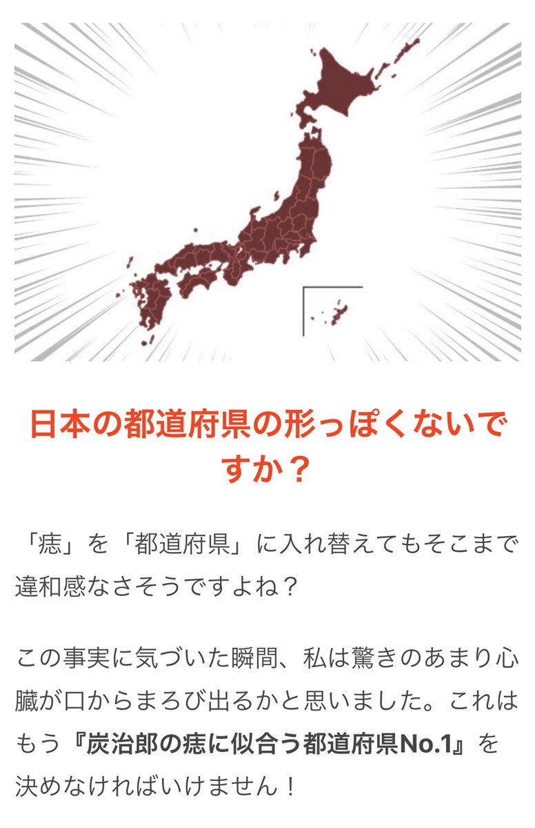 オモコロ on twitter 4 1の特集 鬼滅の刃 炭治郎の痣っぽい都道府県を探す https t co pfkkjwiehv 炭治郎の痣にしっくりくる都道府県をひたすらに探しました 47都道府県ぜんぶ顔に貼った労力だけでもご覧ください