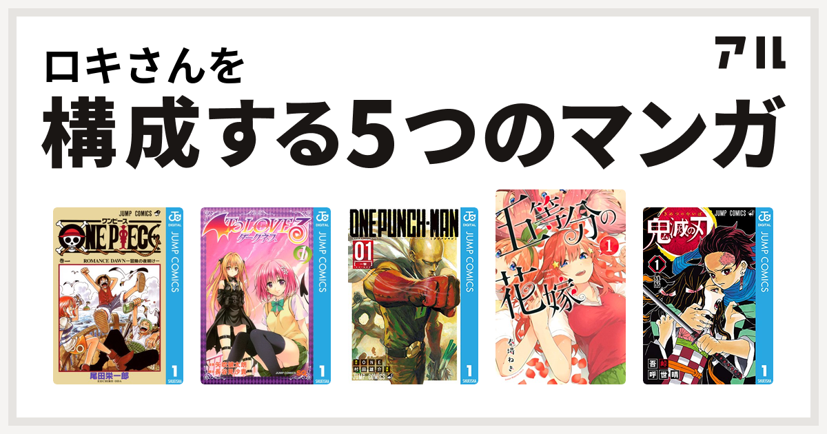 ロキさんを構成するマンガはone piece to loveる とらぶる ダークネス ワンパンマン 五等分の花嫁 鬼滅の刃 私を構成する5つのマンガ アル