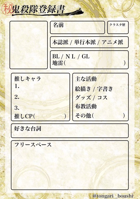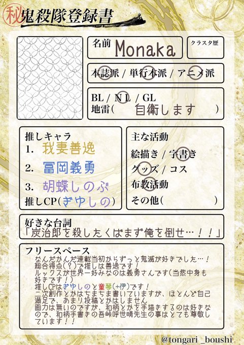 鬼滅の刃の自己紹介テンプレートの元画が欲しいです 製作者様のtwitt yahoo 知恵袋