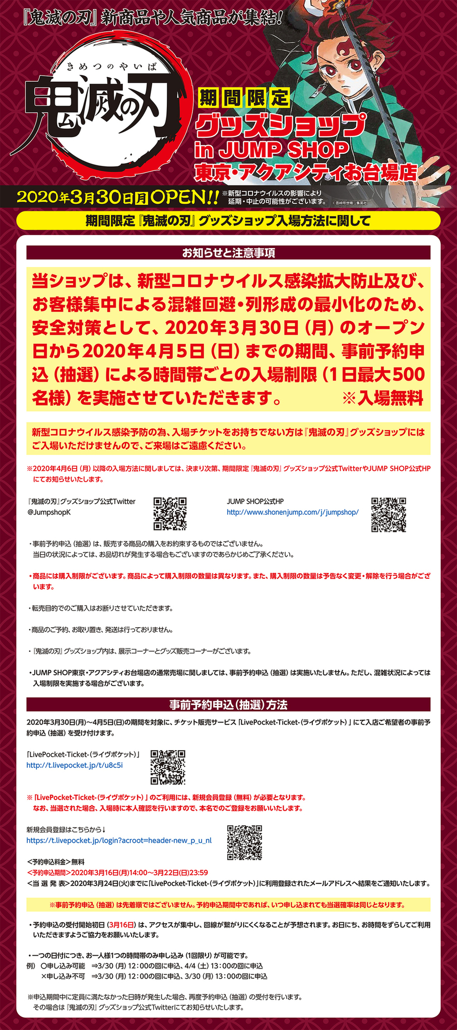 期間限定 鬼滅の刃 グッズショップin jump shop東京 アクアシティお台場店 on twitter 期間限定 鬼滅の刃 グッズショップ入店二次募集 抽選 のお知らせ 下記の期間の二次 抽選 募集を受付いたします 対象期間 7 13 月 7 19 日 空き枠のみ 予約申込期間 お