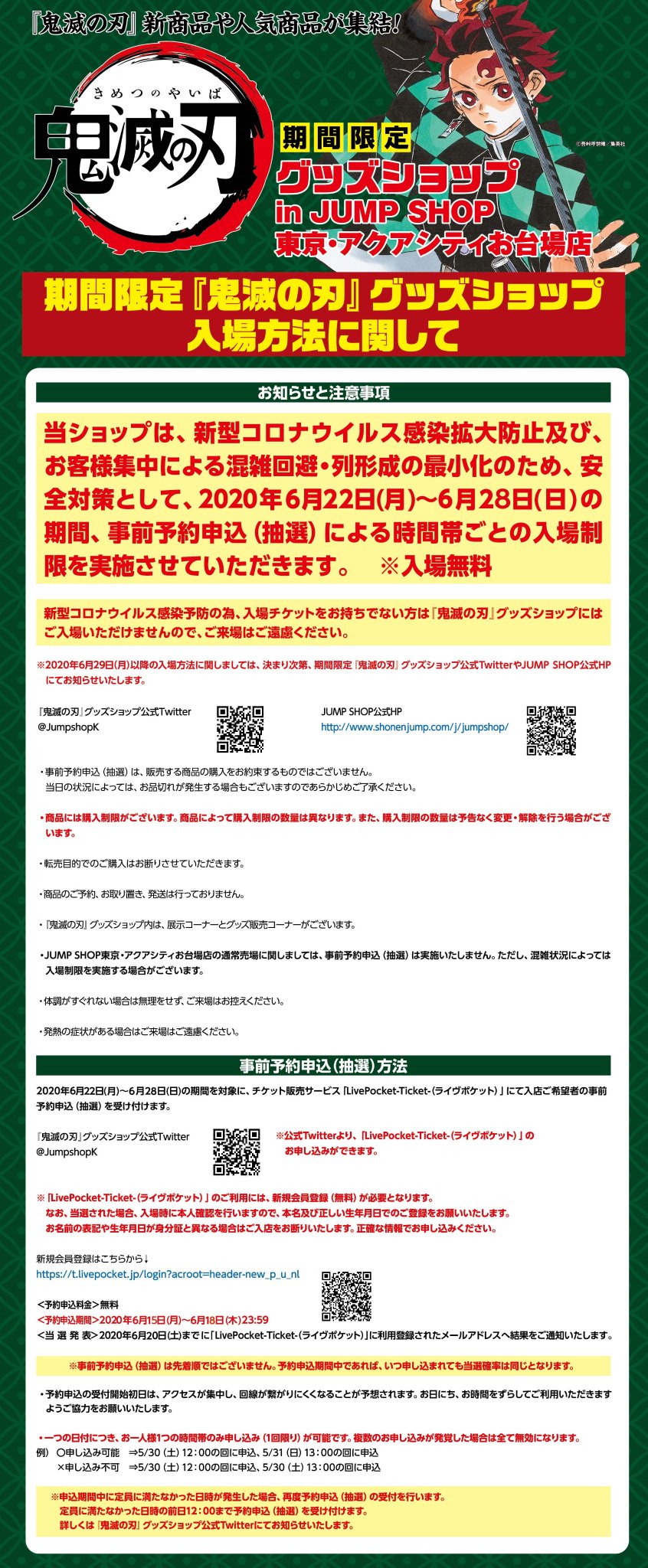 期間限定 鬼滅の刃 グッズショップin jump shop東京 アクアシティお台場店 on twitter 期間限定 鬼滅の刃 グッズショップ事前予約受付 下記の期間の事前予約を受付いたします 対象期間 6 22 月 6 28 日 予約申込期間 6 15 月 6 18 木 23 59 当選発表 6